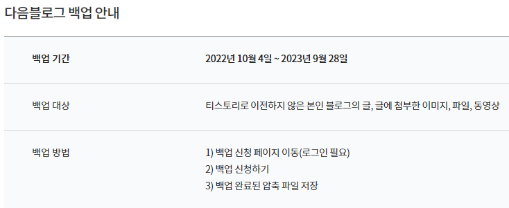 그동안 Daum블로그 서비스를 이용해주셔서 진심으로 감사드립니다. 아쉽게도 22년 9월 30일에 Daum블로그 서비스가 종료되었음을 알려드립니다. 작성하신 글과 첨부한 이미지, 파일, 동영상은 다운로드가 가능하도록 백업 기능을 마련했으니 아래 일정을 확인하시고, 기간 내에 꼭 백업을 신청해 주시기 바랍니다.