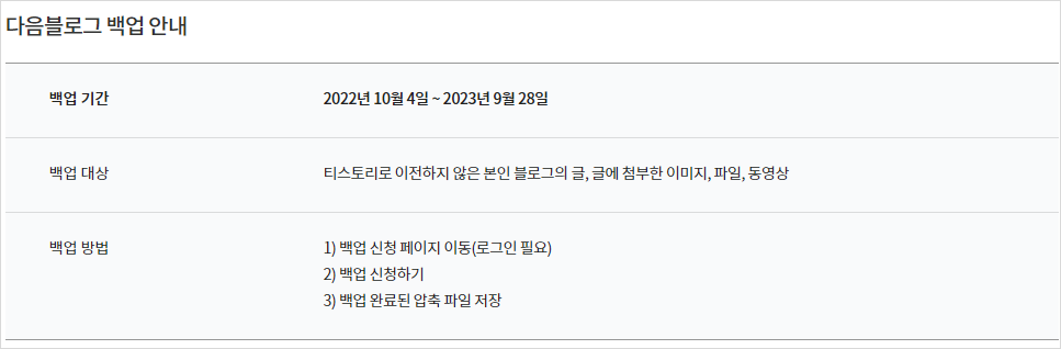 그동안 Daum블로그 서비스를 이용해주셔서 진심으로 감사드립니다. 아쉽게도 22년 9월 30일에 Daum블로그 서비스가 종료되었음을 알려드립니다. 작성하신 글과 첨부한 이미지, 파일, 동영상은 다운로드가 가능하도록 백업 기능을 마련했으니 아래 일정을 확인하시고, 기간 내에 꼭 백업을 신청해 주시기 바랍니다.